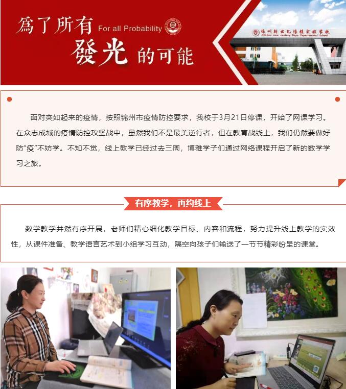 面对突如起来的疫情,按照锦州市疫情防控要求,我校于3月21日停课,开始了网课学习。在众志成城的疫情防控攻坚战中,虽然我们不是最美逆行者,但在教育战线上,我们仍然要做好防“疫”不妨学。不知不觉,线上教学已经过去三周,...