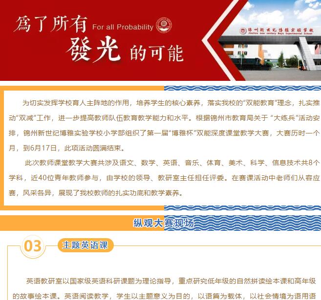 此次教师课堂教学大赛共涉及语文、数学、英语、音乐、体育、美术、科学、信息技术共8个学科,近40位青年教师参与,由学校的领导、教研室主任担任评委。在赛课活动中老师们从容应赛,风采各异,展现了我校教师的扎实功底和教学素养。请您点击文字或是下方图片查看详细内容。