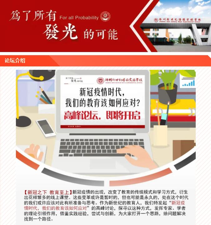 2022年4月16日晚7:00,“新冠疫情时代,我们的教育该如何应对?”高峰论坛如期举行。本次论坛由北大新世纪教育研究院主办,锦州新世纪博雅实验学校和北大新世纪章丘实验学校协办,心理学专家张晓娟博士和周霞博士,教育专家高...