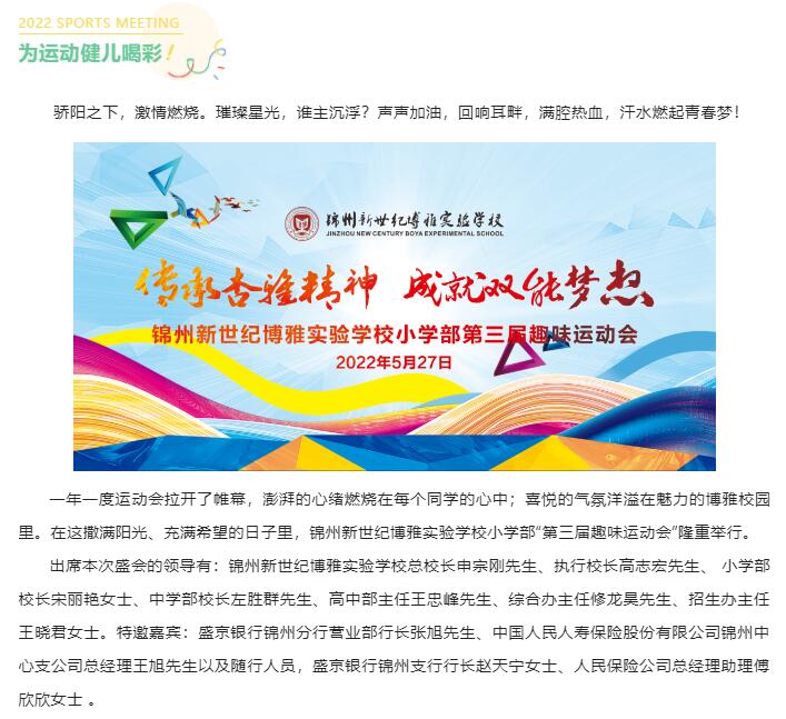 一年一度运动会拉开了帷幕,澎湃的心绪燃烧在每个同学的心中;喜悦的气氛洋溢在魅力的博雅校园里。在这撒满阳光、充满希望的日子里,锦州新世纪博雅实验学校小学部“第三届趣味运动会”隆重举行。请您点击文字或是下方图片查看详细内容。