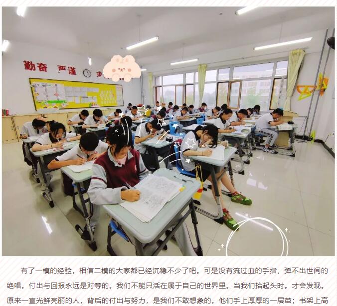 著名作家龙应台说过“时间是一只藏在黑暗中的温柔的手,在你一出神一恍惚之间,物走星移。”在过去数个日夜里,回首过去蓦然发现,我们都还没有倾尽所有,可留给我们的时间已然不多了,它经不起再去挥霍了。一模之前,我相信,大家肯定都和父母、老师保证过,一定会取得一个好成绩。可当坐在考场时,恍然大悟,其实会的东西并不多,正可谓“书到用时方恨少”。成绩出来的那天,既没有金字红榜,也没有答题卡上血一般刺眼的数字。可它就像一个会随时背叛你的朋友,让你心怀不安地度过二模前的一个月。请您点击文字或是下方图片查看详细内容。