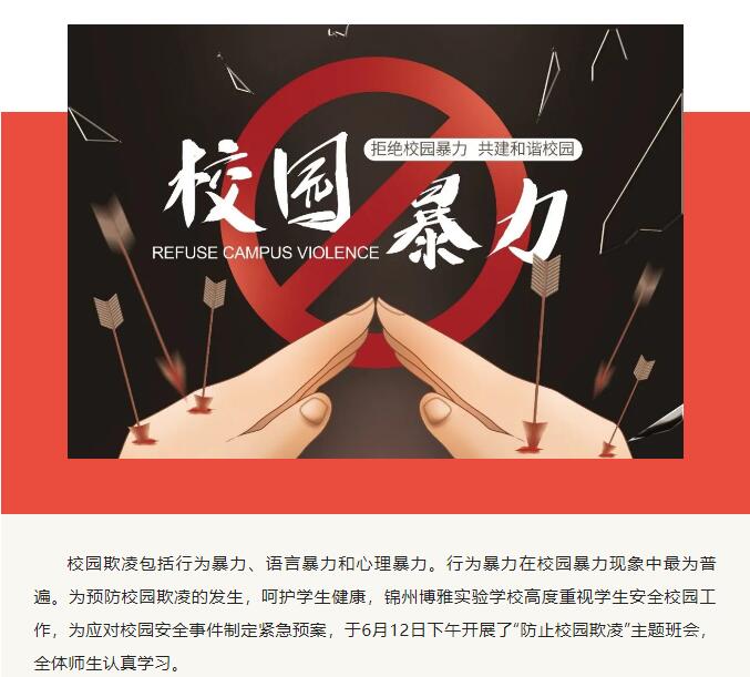 校园欺凌包括行为暴力、语言暴力和心理暴力。行为暴力在校园暴力现象中最为普遍。为预防校园欺凌的发生,呵护学生健康,锦州博雅实验学校高度重视学生安全校园工作,为应对校园安全事件制定紧急预案,于6月12日下午开展了“防止校园欺凌”主题班会,全体师生认真学习。请您点击文字或是下方图片查看详细内容。