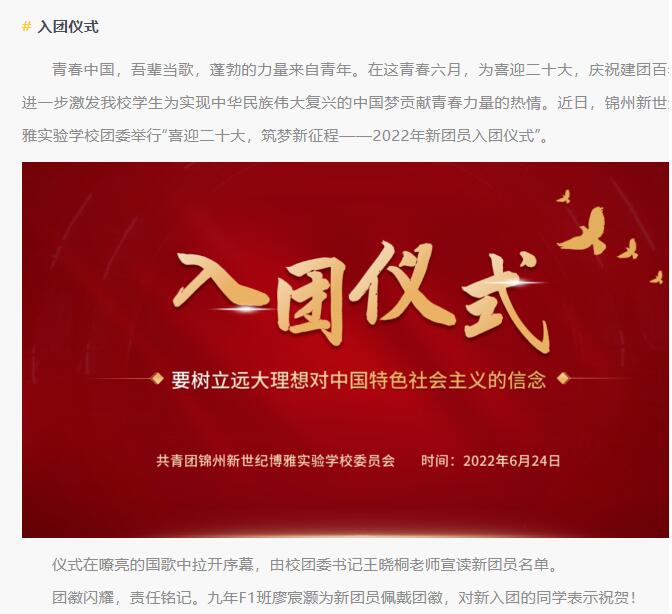 青春中国,吾辈当歌,蓬勃的力量来自青年。在这青春六月,为喜迎二十大,庆祝建团百年,进一步激发我校学生为实现中华民族伟大复兴的中国梦贡献青春力量的热情。近日,锦州新世纪博雅实验学校团委举行“喜迎二十大,筑梦新征程——2022年新团员入团仪式”。请您点击文字或是下方图片查看详细内容。