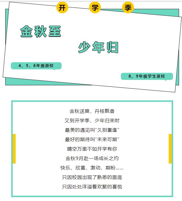 根据疫情防控要求,9月1日,我校小学部、初中部各年级分批次错时入校。校领导和教师们早早地站在校园门口,热切地欢迎孩子们归来。在老师们的指引下,间隔1米列队,依次有序通过入校验码、行李消毒、体温监测等一系列步骤后,体...