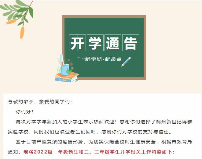 锦州市新世纪博雅实验学校小学部一、二、三年级入学须知