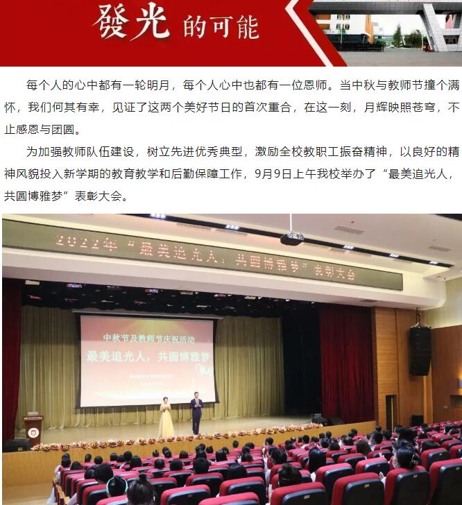 为加强教师队伍建设,树立先进优秀典型,激励全校教职工振奋精神,以良好的精神风貌投入新学期的教育教学和后勤保障工作,9月9日上午我校举办了“最美追光人,共圆博雅梦”表彰大会。请您点击文字或是下方图片查看详细内容。