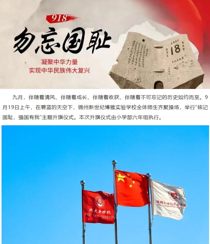 九月,伴随着清风、伴随着成长、伴随着收获、伴随着不可忘记的历史如约而至。9月19日上午,在碧蓝的天空下,锦州新世纪博雅实验学校全体师生齐聚操场,举行“铭记国耻,强国有我”主题升旗仪式。本次升旗仪式由小学部六年组执行...