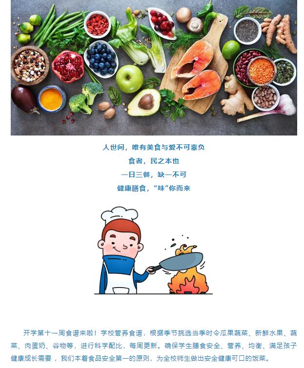 开学第十一周食谱来啦!学校营养食谱,根据季节挑选当季时令瓜果蔬菜、新鲜水果、蔬菜、肉蛋奶、谷物等,进行科学配比,每周更新。确保学生膳食安全、营养、均衡、满足孩子健康成长需要 ,我们本着食品安全第一的原则,为全校师...