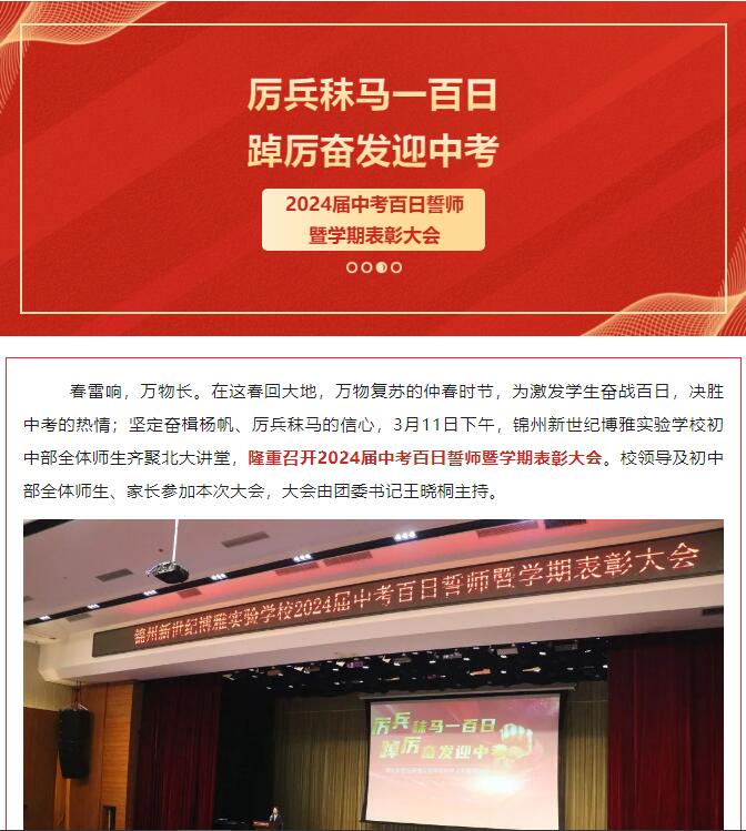 我校隆重举行2024届中考百日誓师暨学期表彰大会-媒体报道-锦州新世纪博雅实验学校